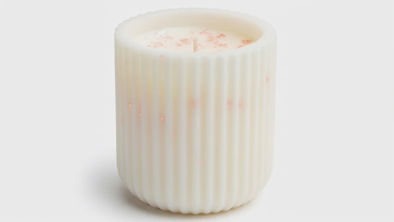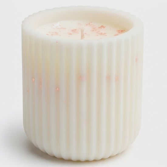 Η ραβδωτή του επιφάνεια αγκαλιάζει απαλά το φως, ενώ λεπτομέρειες από ροζ φύλλα χρυσού είναι ενσωματωμένες στο σώμα του κεριού, δημιουργώντας διακριτικές αντανακλάσεις και μια αίσθηση ήσυχης πολυτέλειας.